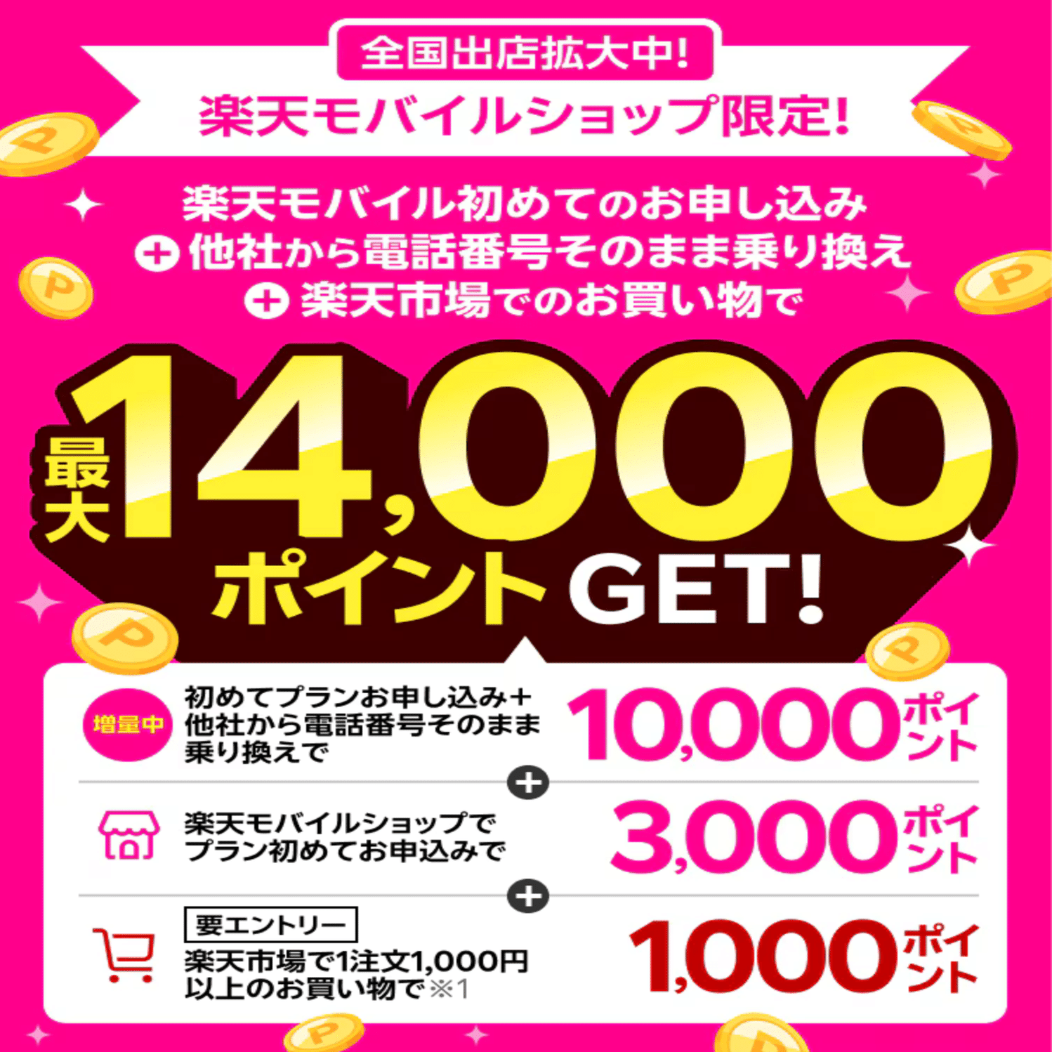 - 条件:楽天モバイルショップでの新規契約 or 他社からの乗り換え(MNP)
